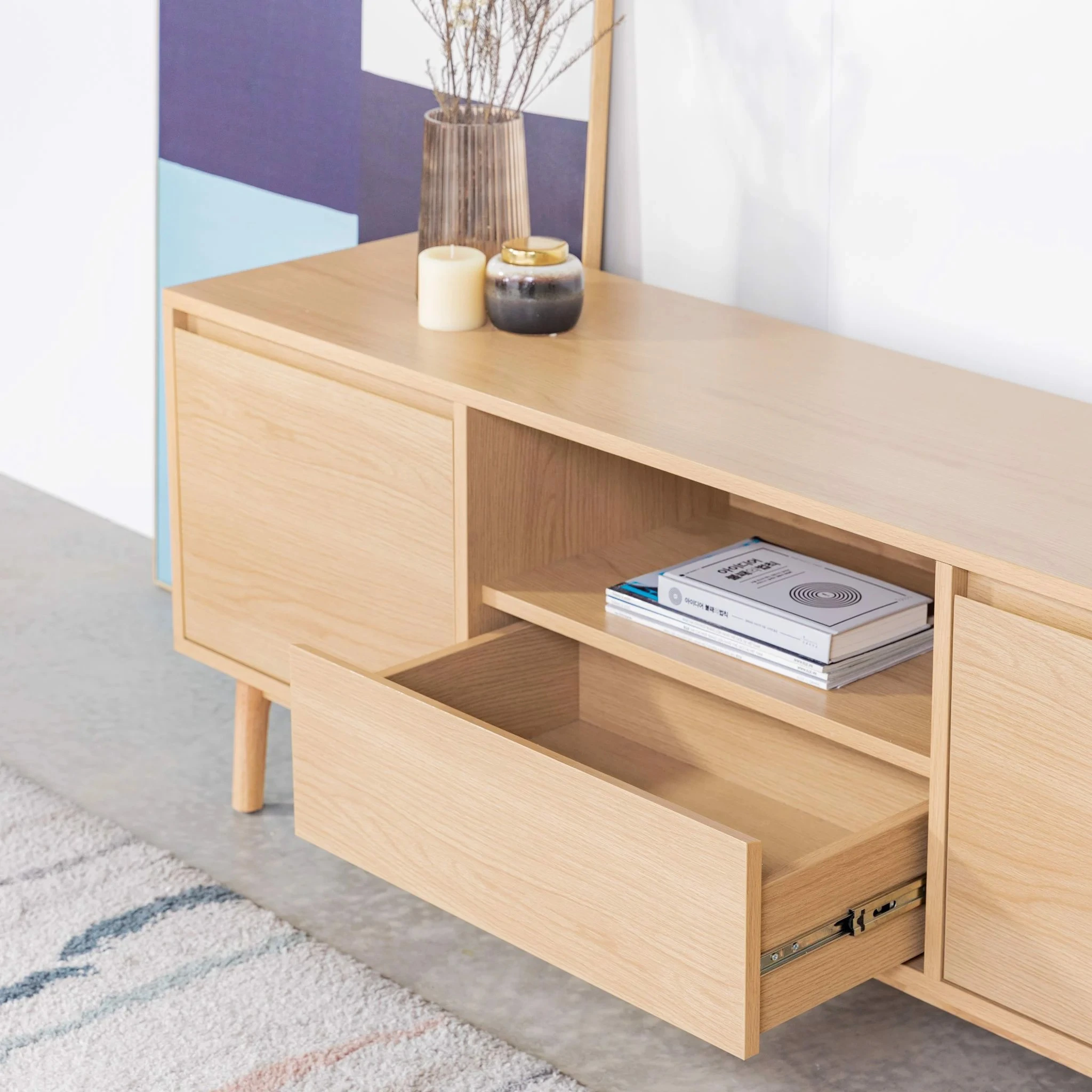 Ngăn kéo tủ có kích thước rộng, kéo mở toàn phần giúp tăng không gian lưu trữ các vật dụng cần thiết trong gia đình.